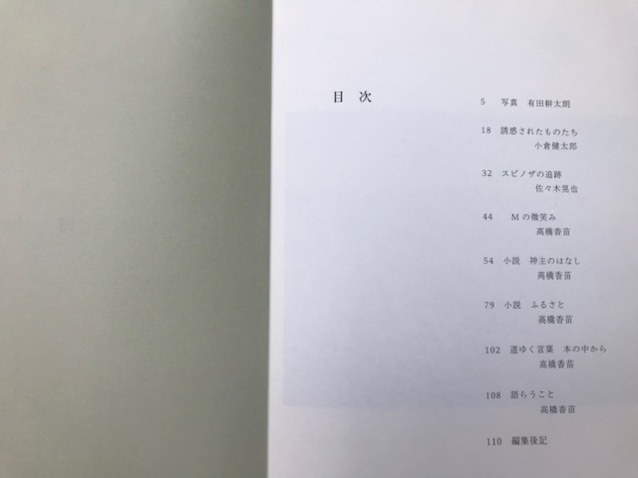別々の職業を持ち、ベースとなる日常生活もバラバラながら、自身の心情や身体感覚から勝手に降りてくることを文字に起こしたものが今回も原稿となって集まりました。批評、論考、小説と形態も異なりながら、不思議と共通して立ち現れてきたものがあります。小倉健太郎が寄せたのは、人間の「欲望」の本質への接近に、ウィトゲンシュタインの言語ゲームを省察することでした。その具体例に小林秀雄の随筆「人形」を借りて見ていきます。小倉が繰り返し展開するエゴであるかセルフであるかの発動の源泉の違いが、ここでも「欲望」への鋭い読みにつながります。まさに現代社会の盲点を付いてくる。それはそのまま「己を虚しくする」ことでそこへ善きもの、輝かしいものが逆に注ぎ込まれる。「今に吹き込む」と小倉が注目した言葉は自分が立つ地点からの拓きとなってそれは図らずとも自己を救うことにつながるとも言える。高橋の小説「神主のはなし」「ふるさと」も相変わらずぼんやり曖昧ながら、どこか自己救済を匂わせている。心奪われ執着したものが一気に剥がされたとしても、何らかの救いは思わぬところからやってくる。17世紀において真に人が救われることとは、と厳密な幾何学形式で説いたスピノザを研究する佐々木は、「エチカ」第4部に起きている不在の公理に着目し、本文においてそこへの追跡を始めました。「エチカ」を単に研究対象にするだけでなく人生の並走者としてスピノザを敬愛してやまない佐々木ならではの肉迫ぶりです。